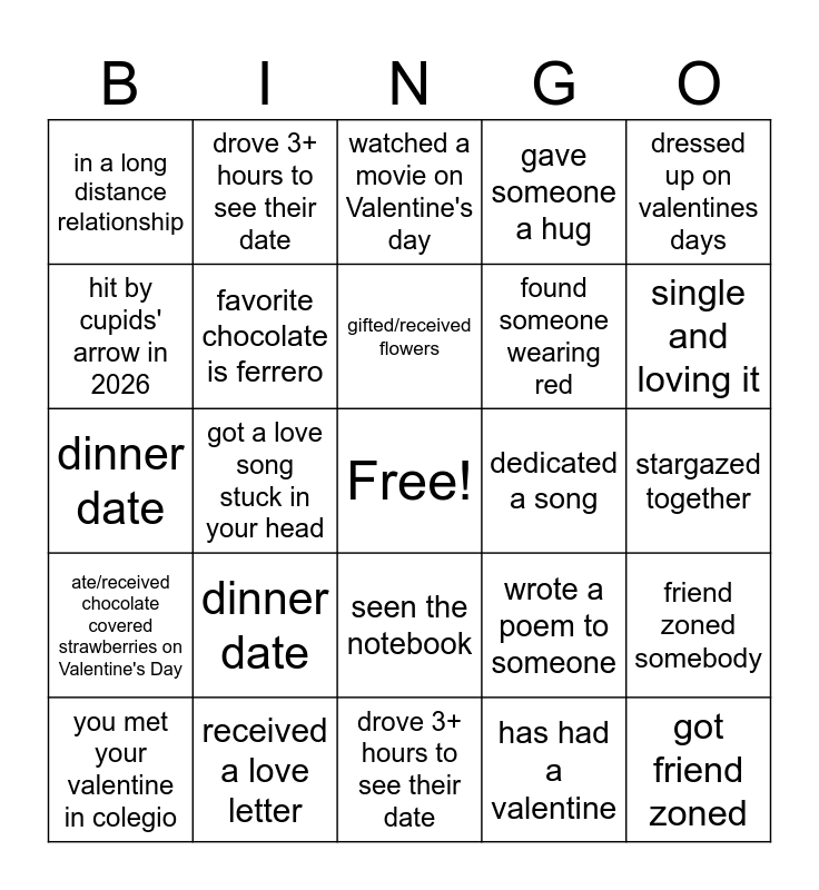 This bingo card has a free space and 25 words: dinner date, drove 3+ hours to see their date, gifted/received flowers, you met your valentine in colegio, dressed up on valentines days, in a long distance relationship, hit by cupids' arrow in 2026, drove 3+ hours to see their date, dedicated a song, seen the notebook, found someone wearing red, dinner date, wrote a poem to someone, friend zoned somebody, favorite chocolate is ferrero, asked someone to be your valentines, stargazed together, watched a movie on Valentine's day, single and loving it, got a love song stuck in your head, got friend zoned, received a love letter, ate/received chocolate covered strawberries on Valentine's Day, gave someone a hug and has had a valentine.