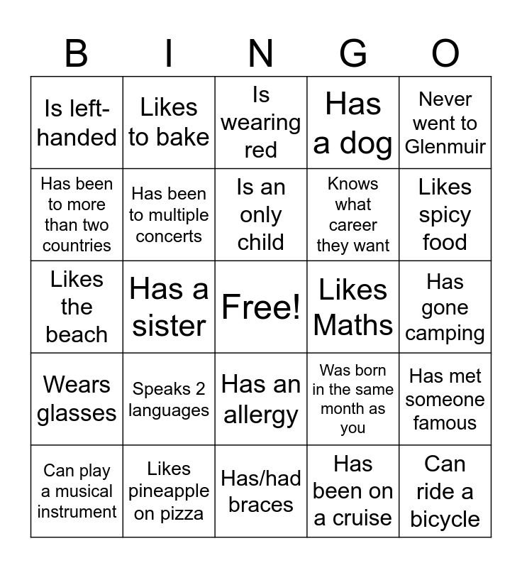 This bingo card has a free space and 24 words: Speaks 2 languages, Likes pineapple on pizza, Is an only child, Can play a musical instrument, Never went to Glenmuir, Is left-handed, Has been to more than two countries, Likes to bake, Likes Maths, Has an allergy, Knows what career they want, Likes the beach, Was born in the same month as you, Has met someone famous, Has been to multiple concerts, Has been on a cruise, Has gone camping, Is wearing red, Likes spicy food, Has a sister, Can ride a bicycle, Wears glasses, Has a dog and Has/had braces.
