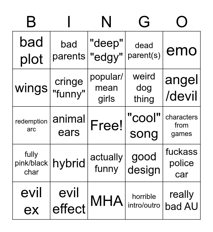 This bingo card has a free space and 29 words: evil ex, gacha heat, animal ears, bad design, bad plot, "deep" "edgy", cringe "funny", hybrid, "cool" song, evil effect, characters from games, really bad AU, MHA, horrible intro/outro, angel /devil, spoiled sibling, actually funny, fully pink/black char, emo, redemption arc, good design, good plot, weird dog thing, wings, dead parent(s), bad parents, fuckass police car, popular/ mean girls and loser (mc/friend).