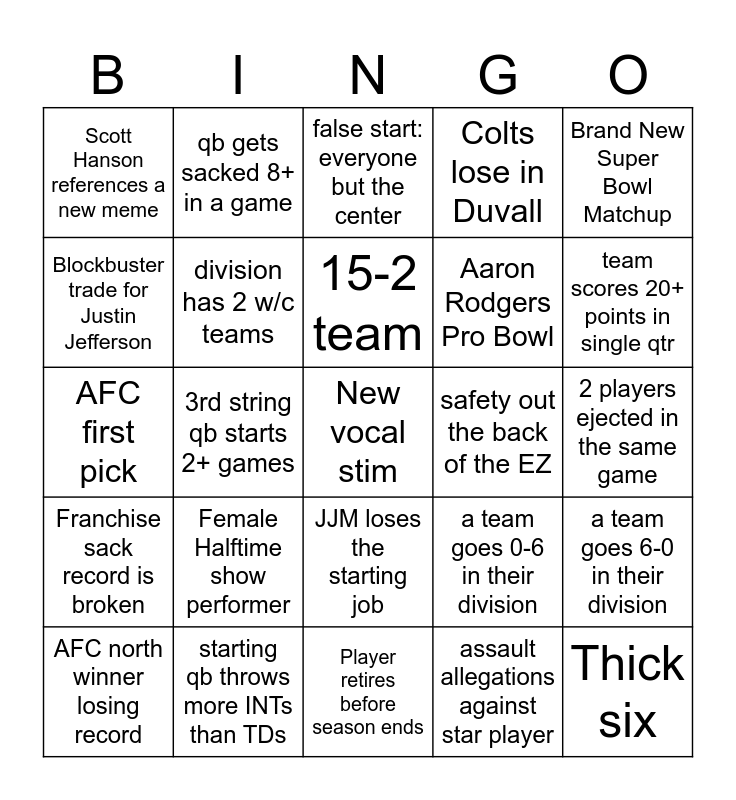 This bingo card has a free space and 24 words: Female Halftime show performer, starting qb throws more INTs than TDs, 15-2 team, AFC north winner losing record, Brand New Super Bowl Matchup, Scott Hanson references a new meme, Blockbuster trade for Justin Jefferson, qb gets sacked 8+ in a game, safety out the back of the EZ, JJM loses the starting job, Aaron Rodgers Pro Bowl, AFC first pick, a team goes 0-6 in their division, a team goes 6-0 in their division, division has 2 w/c teams, assault allegations against star player, 2 players ejected in the same game, false start: everyone but the center, team scores 20+ points in single qtr, 3rd string qb starts 2+ games, Thick six, Franchise sack record is broken, Colts lose in Duvall and Player retires before season ends.
