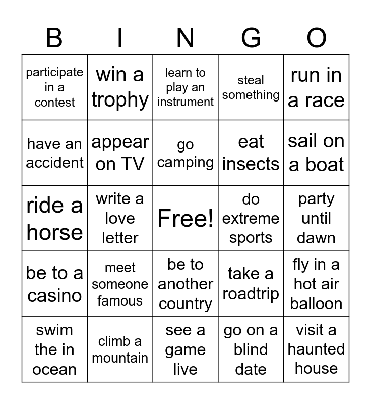 This bingo card has a free space and 24 words: meet someone famous, climb a mountain, go camping, swim the in ocean, run in a race, participate in a contest, have an accident, win a trophy, do extreme sports, be to another country, eat insects, ride a horse, take a roadtrip, fly in a hot air balloon, appear on TV, go on a blind date, party until dawn, learn to play an instrument, sail on a boat, write a love letter, visit a haunted house, be to a casino, steal something and see a game live.