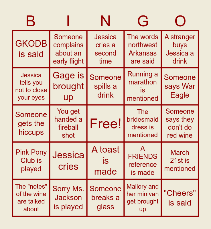 This bingo card has a free space and 24 words: Jessica cries, Sorry Ms. Jackson is played, Someone spills a drink, The "notes" of the wine are talked about, A stranger buys Jessica a drink, GKODB is said, Jessica tells you not to close your eyes, Someone complains about an early flight, The bridesmaid dress is mentioned, A toast is made, Running a marathon is mentioned, Someone gets the hiccups, A FRIENDS reference is made, March 21st is mentioned, Gage is brought up, Mallory and her minivan get brought up, Someone says they don't do red wine, Jessica cries a second time, Someone says War Eagle, You get handed a fireball shot, "Cheers" is said, Pink Pony Club is played, The words northwest Arkansas are said and Someone breaks a glass.