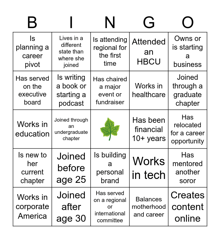 This bingo card has a free space and 24 words: Joined before age 25, Joined after age 30, Has chaired a major event or fundraiser, Works in corporate America, Owns or is starting a business, Is planning a career pivot, Has served on the executive board, Lives in a different state than where she joined, Has been financial 10+ years, Is building a personal brand, Works in healthcare, Works in education, Works in tech, Has mentored another soror, Is writing a book or starting a podcast, Balances motherhood and career, Has relocated for a career opportunity, Is attending regional for the first time, Joined through a graduate chapter, Joined through an undergraduate chapter, Creates content online, Is new to her current chapter, Attended an HBCU and Has served on a regional or international committee.
