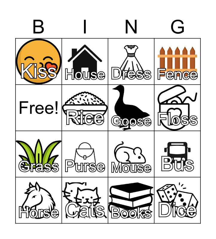 This bingo card has 15 images and 16 words: Cats, Bus, Dress, Kiss, Grass, House, Mouse, Books, Free!, Rice, Horse, Fence, Purse, Floss, Goose and Dice.