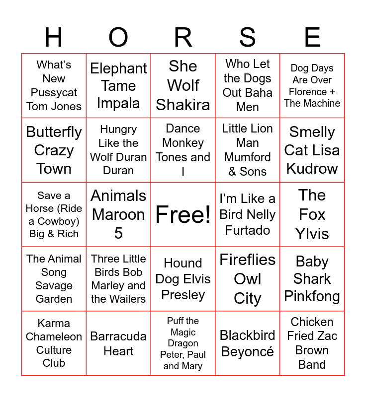 This bingo card has a free space and 35 words: Eye of the Tiger Survivor, The Lion Sleeps Tonight The Tokens, Cat’s in the Cradle Harry Chapin, Hungry Like the Wolf Duran Duran, Hound Dog Elvis Presley, Who Let the Dogs Out Baha Men, Butterfly Crazy Town, Crocodile Rock Elton John, Dance Monkey Tones and I, Dark Horse Katy Perry, Save a Horse (Ride a Cowboy) Big & Rich, Dog Days Are Over Florence + The Machine, Buffalo Soldier Bob Marley and the Wailers, When Doves Cry Prince, What’s New Pussycat Tom Jones, I’m Like a Bird Nelly Furtado, Blackbird Beyoncé, Animals Maroon 5, The Animal Song Savage Garden, Chicken Fried Zac Brown Band, Fireflies Owl City, Karma Chameleon Culture Club, Baby Shark Pinkfong, Barracuda Heart, She Wolf Shakira, Smelly Cat Lisa Kudrow, The Horses Daryl Braithwaite, A Horse with No Name America, Little Lion Man Mumford & Sons, The Fox Ylvis, Pony Ginuwine, Puff the Magic Dragon Peter, Paul and Mary, Three Little Birds Bob Marley and the Wailers, Elephant Tame Impala and Tie Me Kangaroo Down Sport Rolf Harris.