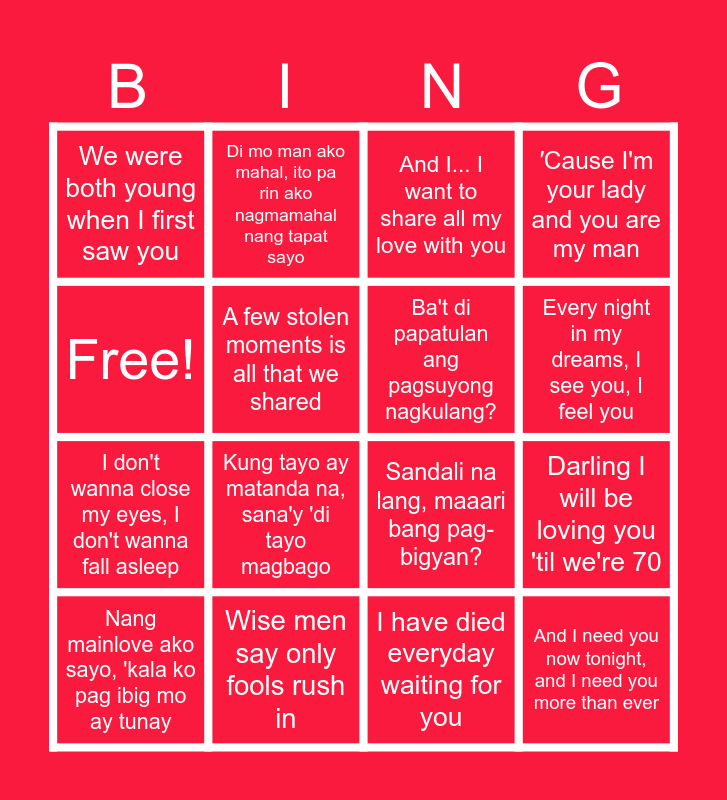 This bingo card has 16 words: Wise men say only fools rush in, Darling I will be loving you 'til we're 70, And I... I want to share all my love with you, We were both young when I first saw you, I don't wanna close my eyes, I don't wanna fall asleep, Di mo man ako mahal, ito pa rin ako nagmamahal nang tapat sayo, Sandali na lang, maaari bang pag-bigyan?, I have died everyday waiting for you, Free!, A few stolen moments is all that we shared, Nang mainlove ako sayo, 'kala ko pag ibig mo ay tunay, ′Cause I'm your lady and you are my man, Kung tayo ay matanda na, sana'y 'di tayo magbago, Every night in my dreams, I see you, I feel you, Ba't di papatulan ang pagsuyong nagkulang? and And I need you now tonight, and I need you more than ever.