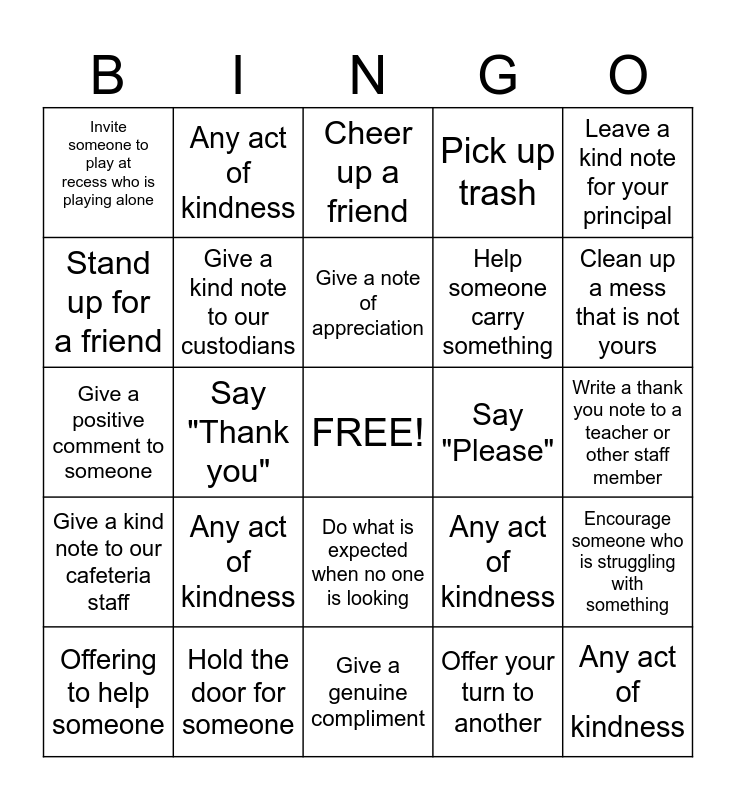 This bingo card has a free space and 24 words: Any act of kindness, Hold the door for someone, Give a note of appreciation, Offering to help someone, Leave a kind note for your principal, Invite someone to play at recess who is playing alone, Stand up for a friend, Any act of kindness, Say "Please", Do what is expected when no one is looking, Help someone carry something, Give a positive comment to someone, Any act of kindness, Encourage someone who is struggling with something, Give a kind note to our custodians, Offer your turn to another, Write a thank you note to a teacher or other staff member, Cheer up a friend, Clean up a mess that is not yours, Say "Thank you", Any act of kindness, Give a kind note to our cafeteria staff, Pick up trash and Give a genuine compliment.
