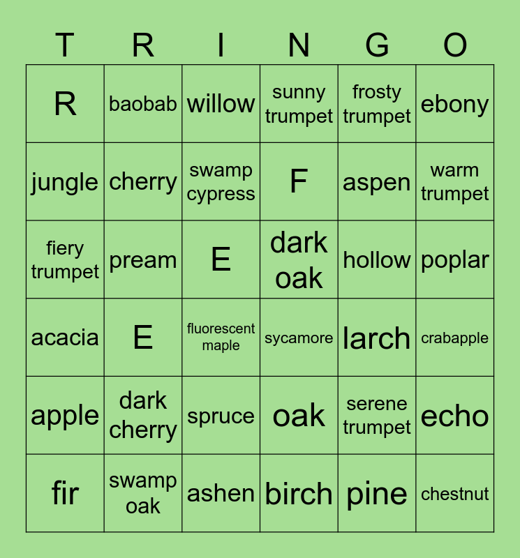 This bingo card has 36 words: oak, spruce, birch, jungle, acacia, dark oak, cherry, ashen, frosty trumpet, serene trumpet, warm trumpet, sunny trumpet, echo, pream, F, R, apple, hollow, fiery trumpet, willow, E, E, sycamore, fluorescent maple, larch, baobab, aspen, swamp oak, swamp cypress, ebony, chestnut, fir, crabapple, poplar, dark cherry and pine.