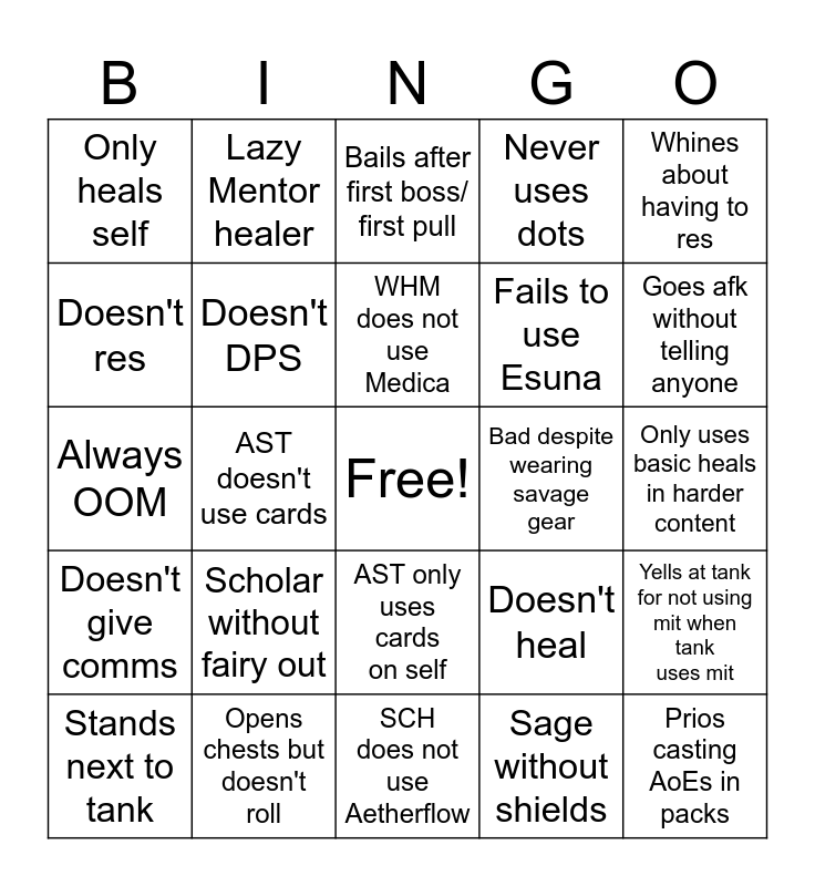 This bingo card has a free space and 24 words: Scholar without fairy out, Opens chests but doesn't roll, WHM does not use Medica, Stands next to tank, Whines about having to res, Only heals self, Doesn't res, Lazy Mentor healer, Bad despite wearing savage gear, AST only uses cards on self, Fails to use Esuna, Always OOM, Doesn't heal, Yells at tank for not using mit when tank uses mit, Doesn't DPS, Sage without shields, Only uses basic heals in harder content, Bails after first boss/ first pull, Goes afk without telling anyone, AST doesn't use cards, Prios casting AoEs in packs, Doesn't give comms, Never uses dots and SCH does not use Aetherflow.