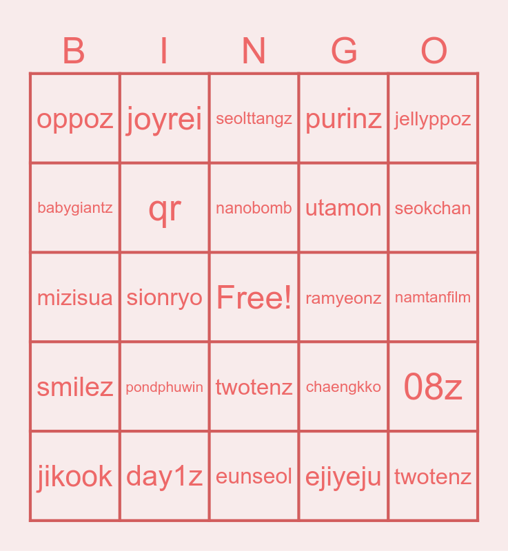 This bingo card has a free space and 24 words: jikook, pondphuwin, nanobomb, ejiyeju, jellyppoz, oppoz, joyrei, seolttangz, ramyeonz, namtanfilm, mizisua, qr, chaengkko, 08z, babygiantz, day1z, eunseol, purinz, seokchan, smilez, sionryo, twotenz, utamon and twotenz.