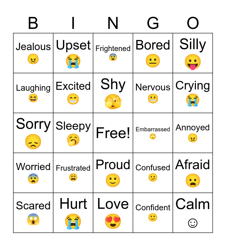 This bingo card has a free space and 39 words: Happy😀, Sad😞, Angry😠, Excited😁, Scared😱, Proud🙂, Shy🫣, Tired😴, Silly😛, Worried😨, Sleepy🥱, Bored😐, Calm☺️, Annoyed😠, Embarrassed🙄, Frustrated😩, Disappointed☹️, Jealous😠, Disgusted🤮, Confused🫤, Laughing😆, Love😍, Nervous😬, Crying😭, Surprised😮, Scary😦, Sick🤒, Grumpy😠, Shocked😮, Upset😭, Curious🤨, Brave🙂, Frightened 😨, Hurt😭, Confident🙂, Guilty😞, Afraid😦, Sorry😞 and Furious😡.