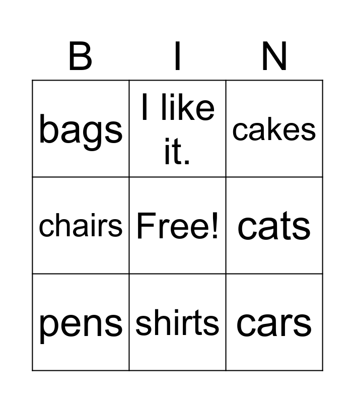 This bingo card has a free space and 19 words: apples, nuts, cakes, oranges, books, cars, trains, bags, I like it., I don't like it., birds, cats, pens, boats, rabbits, skates, chairs, shirts and tables.