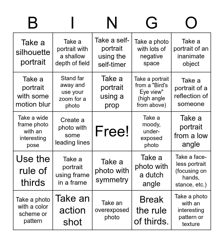 This bingo card has a free space and 24 words: Take a portrait using frame in a frame, Take an action shot, Take a portrait using a prop, Take a photo with a color scheme or pattern, Take a portrait of an inanimate object, Take a silhouette portrait, Take a portrait with some motion blur, Take a portrait with a shallow depth of field, Take a moody, under-exposed photo, Take a photo with symmetry, Take a portrait from a "Bird's Eye view" (high angle from above), Take a wide frame photo with an interesting pose, Take a photo with a dutch angle, Take a face-less portrait (focusing on hands, stance, etc.), Stand far away and use your zoom for a photo, Break the rule of thirds., Take a portrait from a low angle, Take a self-portrait using the self-timer, Take a portrait of a reflection of someone, Create a photo with some leading lines, Take a photo with an interesting pattern or texture, Use the rule of thirds, Take a photo with lots of negative space and Take an overexposed photo.