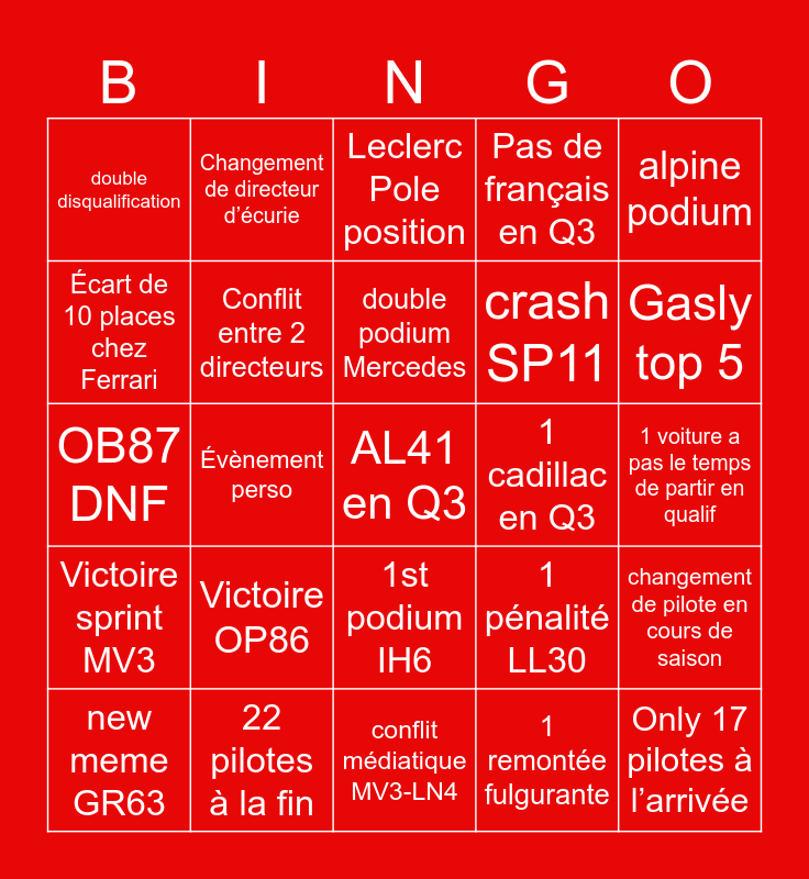 This bingo card has 25 words: Victoire OP86, conflit médiatique MV3-LN4, double podium Mercedes, new meme GR63, alpine podium, double disqualification, Écart de 10 places chez Ferrari, Changement de directeur d’écurie, 1 cadillac en Q3, 1st podium IH6, crash SP11, OB87 DNF, 1 pénalité LL30, changement de pilote en cours de saison, Conflit entre 2 directeurs, Only 17 pilotes à l’arrivée, 1 voiture a pas le temps de partir en qualif, Leclerc Pole position, Gasly top 5, Évènement perso, AL41 en Q3, 22 pilotes à la fin, Victoire sprint MV3, Pas de français en Q3 and 1 remontée fulgurante.