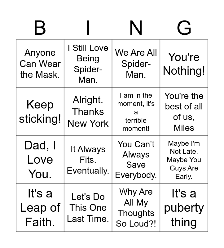 This bingo card has 16 words: Let's Do This One Last Time., Maybe I'm Not Late. Maybe You Guys Are Early., We Are All Spider-Man., Anyone Can Wear the Mask., Dad, I Love You., I Still Love Being Spider-Man., You Can’t Always Save Everybody., Why Are All My Thoughts So Loud?!, Keep sticking!, Alright. Thanks New York, It's a Leap of Faith., You're Nothing!, It Always Fits. Eventually., You're the best of all of us, Miles, I am in the moment, it’s a terrible moment! and It's a puberty thing.