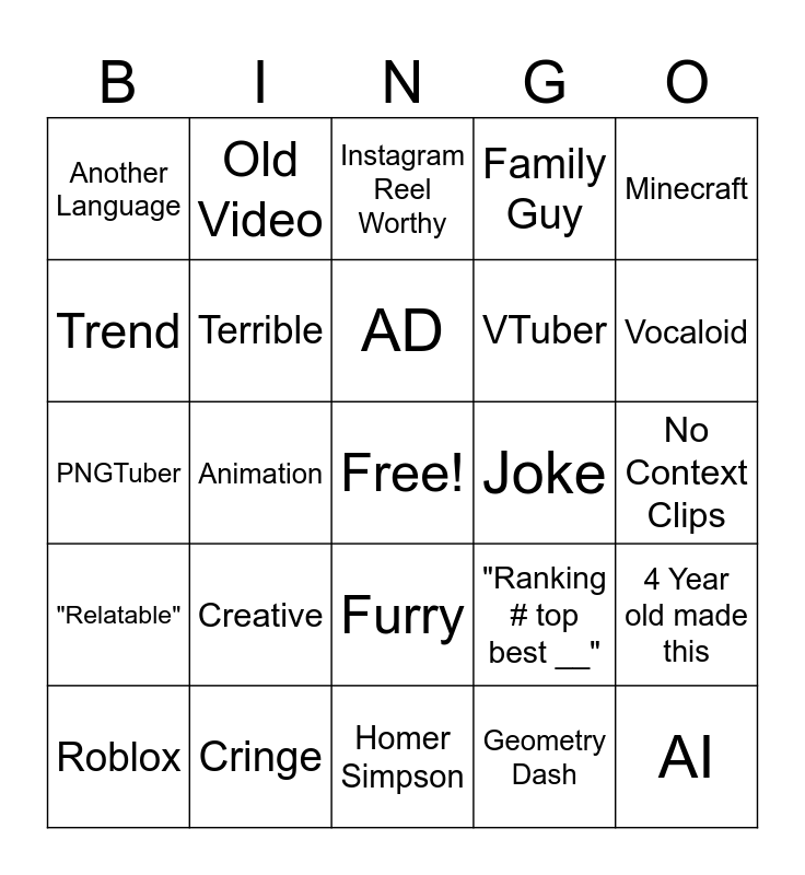 This bingo card has a free space and 24 words: Creative, Cringe, AD, Roblox, Minecraft, Another Language, Trend, Old Video, Joke, Furry, VTuber, PNGTuber, "Ranking # top best __", 4 Year old made this, Terrible, Geometry Dash, No Context Clips, Instagram Reel Worthy, Vocaloid, Animation, AI, "Relatable", Family Guy and Homer Simpson.