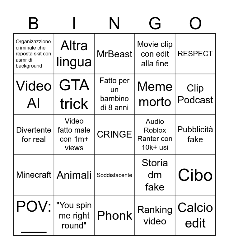 This bingo card has a free space and 24 words: Animali, "You spin me right round", Fatto per un bambino di 8 anni, POV: ___, RESPECT, Organizazzione criminale che reposta skit con asmr di background, Video AI, Altra lingua, Audio Roblox Ranter con 10k+ usi, Soddisfacente, Meme morto, Divertente for real, Storia dm fake, Cibo, GTA trick, Ranking video, Pubblicità fake, MrBeast, Clip Podcast, Video fatto male con 1m+ views, Calcio edit, Minecraft, Movie clip con edit alla fine and Phonk.