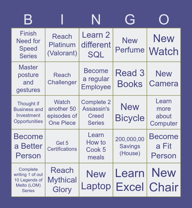 This bingo card has 25 words: Get 5 Certifications, New Laptop, Become a regular Employee, Complete writing 1 of out 10 Legends of Melto (LOM) Series, New Watch, Finish Need for Speed Series, Master posture and gestures, Reach Platinum (Valorant), New Bicycle, Learn How to Cook 5 meals, Read 3 Books, Thought if Business and Investment Opportunities, 200,000,00 Savings (House), Become a Fit Person, Reach Challenger, New Chair, Learn more about Computer, Learn 2 different SQL, New Camera, Watch another 50 episodes of One Piece, Complete 2 Assassin's Creed Series, Reach Mythical Glory, Become a Better Person, New Perfume and Learn Excel.
