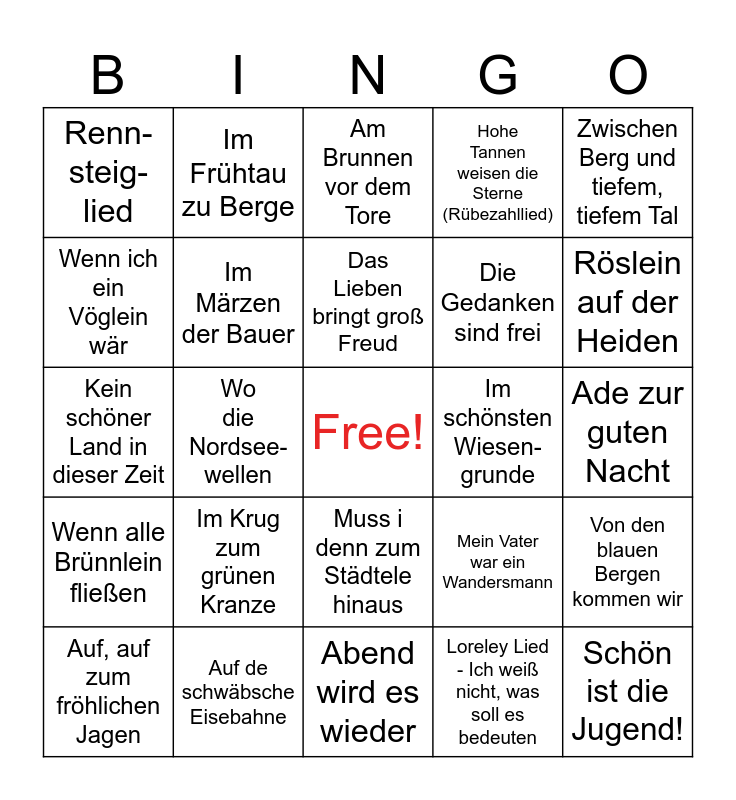 This bingo card has a free space and 24 words: Im Krug zum grünen Kranze, Auf de schwäbsche Eisebahne, Das Lieben bringt groß Freud, Auf, auf zum fröhlichen Jagen, Zwischen Berg und tiefem, tiefem Tal, Renn-steig-lied, Wenn ich ein Vöglein wär, Im Frühtau zu Berge, Im schönsten Wiesen-grunde, Muss i denn zum Städtele hinaus, Die Gedanken sind frei, Kein schöner Land in dieser Zeit, Mein Vater war ein Wandersmann, Von den blauen Bergen kommen wir, Im Märzen der Bauer, Loreley Lied - Ich weiß nicht, was soll es bedeuten, Ade zur guten Nacht, Am Brunnen vor dem Tore, Röslein auf der Heiden, Wo die Nordsee-wellen, Schön ist die Jugend!, Wenn alle Brünnlein fließen, Hohe Tannen weisen die Sterne (Rübezahllied) and Abend wird es wieder.
