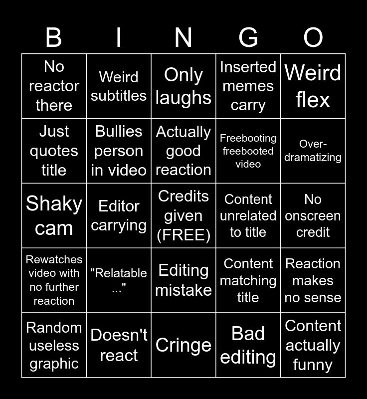 This bingo card has a free space and 24 words: "Relatable ...", Doesn't react, Actually good reaction, Random useless graphic, Weird flex, No reactor there, Just quotes title, Weird subtitles, Content unrelated to title, Editing mistake, Freebooting freebooted video, Shaky cam, Content matching title, Reaction makes no sense, Bullies person in video, Bad editing, No onscreen credit, Only laughs, Over-dramatizing, Editor carrying, Content actually funny, Rewatches video with no further reaction, Inserted memes carry and Cringe.