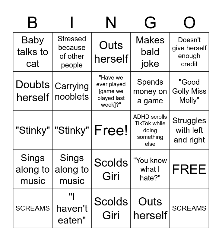 ⚠ This card has duplicate items: "Good Golly Miss Molly" (2), SCREAMS (2), Says the same thing as Rex (2), Scolds Giri (2), Sings along to music (2), Talks about Zayne from Love and Deepspace (2), Stressed because of other people (2), Hyperfixated on something (2), Doubts herself (2), "I haven't eaten" (2), Carrying nooblets (2), Makes bald joke (2), "You know what I hate?" (2), Struggles with left and right (2), "Who texted me?" (2), "Have we ever played [game we played last week]?" (2), ADHD scrolls TikTok while doing something else (2), Tells a story for the 3rd time (2), Doesn't give herself enough credit (2), "Stinky" (2), Outs herself (2), Baby talks to cat (2), Spends money on a game (2), "Oh my Lord" (2)