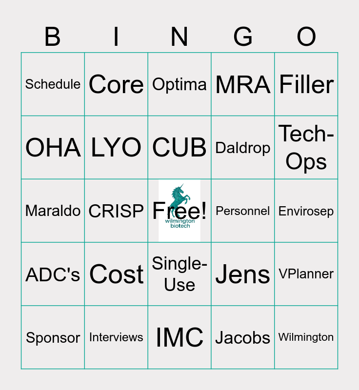 This bingo card has a free space and 24 words: Cost, Interviews, CUB, Sponsor, Filler, Schedule, OHA, Core, Personnel, Single-Use, Daldrop, Maraldo, Jens, VPlanner, LYO, Jacobs, Envirosep, Optima, Tech-Ops, CRISP, Wilmington, ADC's, MRA and IMC.