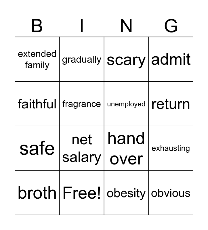 This bingo card has 21 words: Free!, quadruple, gradually, boredom, obesity, unemployed, extended family, scary, hand over, return, safe, admit, obvious, gratitude, fragrance, distract, broth, net salary, faithful, exhausting and competitive.