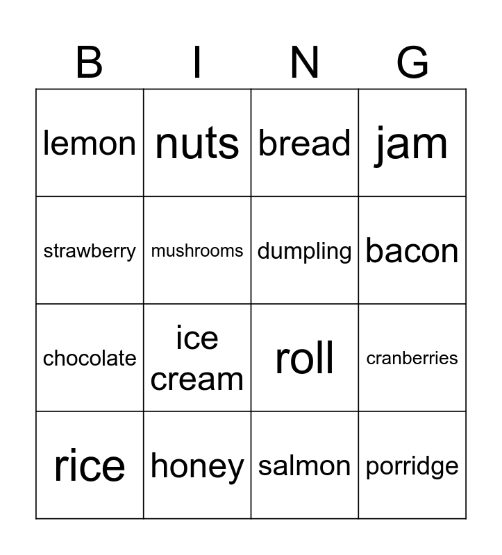 This bingo card has 16 words: honey, cranberries, bread, lemon, chocolate, nuts, roll, salmon, strawberry, mushrooms, rice, jam, ice cream, bacon, dumpling and porridge.