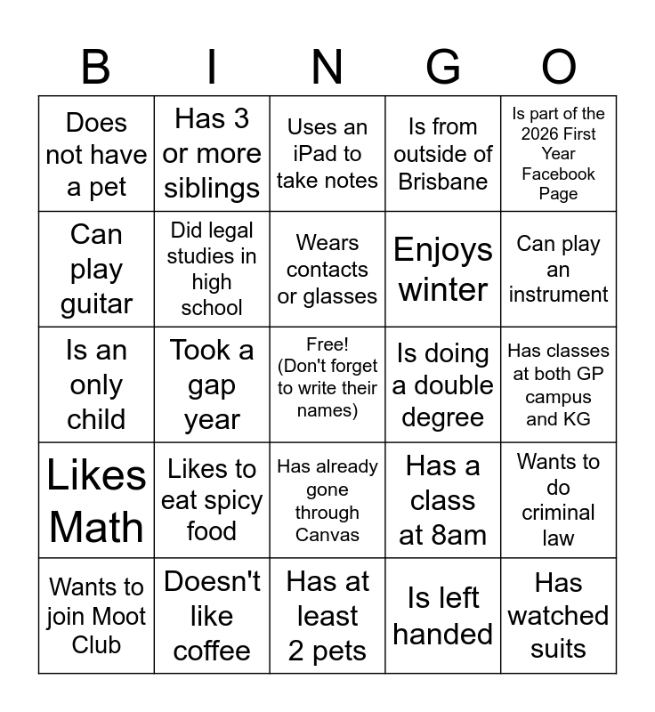 This bingo card has a free space and 24 words: Wants to join Moot Club, Likes to eat spicy food, Wears contacts or glasses, Is left handed, Is part of the 2026 First Year Facebook Page, Does not have a pet, Has 3 or more siblings, Uses an iPad to take notes, Is doing a double degree, Has classes at both GP campus and KG, Is an only child, Did legal studies in high school, Has a class at 8am, Wants to do criminal law, Can play guitar, Doesn't like coffee, Has at least 2 pets, Is from outside of Brisbane, Can play an instrument, Likes Math, Took a gap year, Has already gone through Canvas, Enjoys winter and Has watched suits.