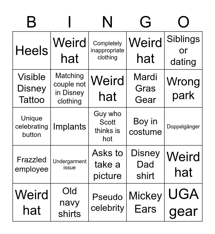 This bingo card has a free space and 29 words: Weird hat, S American tour group, Implants, May December romance, Heels, Completely inappropriate clothing, Matching couple not in Disney clothing, Undergarment issue, Boy in costume, Old navy shirts, Doppelgänger, UGA gear, Pseudo celebrity, Mickey Ears, Wrong park, Someone trips, Asks to take a picture, Frazzled employee, Siblings or dating, Unique celebrating button, Disney Dad shirt, PDA couple, Mardi Gras Gear, Visible Disney Tattoo, Weird hat, Weird hat, Weird hat, Weird hat and Weird hat.