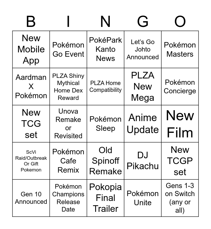 This bingo card has 25 words: Pokémon Cafe Remix, Pokopia Final Trailer, PLZA Home Compatibility, Gen 10 Announced, Pokémon Masters, New Mobile App, Aardman X Pokémon, Pokémon Go Event, Anime Update, Old Spinoff Remake, PLZA New Mega, New TCG set, DJ Pikachu, New TCGP set, PLZA Shiny Mythical Home Dex Reward, Gens 1-3 on Switch (any or all), New Film, PokéPark Kanto News, Pokémon Concierge, Unova Remake or Revisited, Pokémon Sleep, Pokémon Champions Release Date, ScVi Raid/Outbreak Or Gift Pokemon, Let’s Go Johto Announced and Pokémon Unite.
