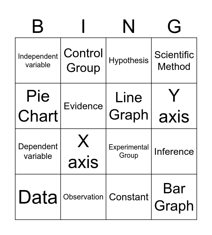 This bingo card has 16 words: Observation, Inference, Hypothesis, Independent variable, Dependent variable, Control Group, Experimental Group, Constant, Pie Chart, Evidence, Data, Scientific Method, X axis, Y axis, Line Graph and Bar Graph.