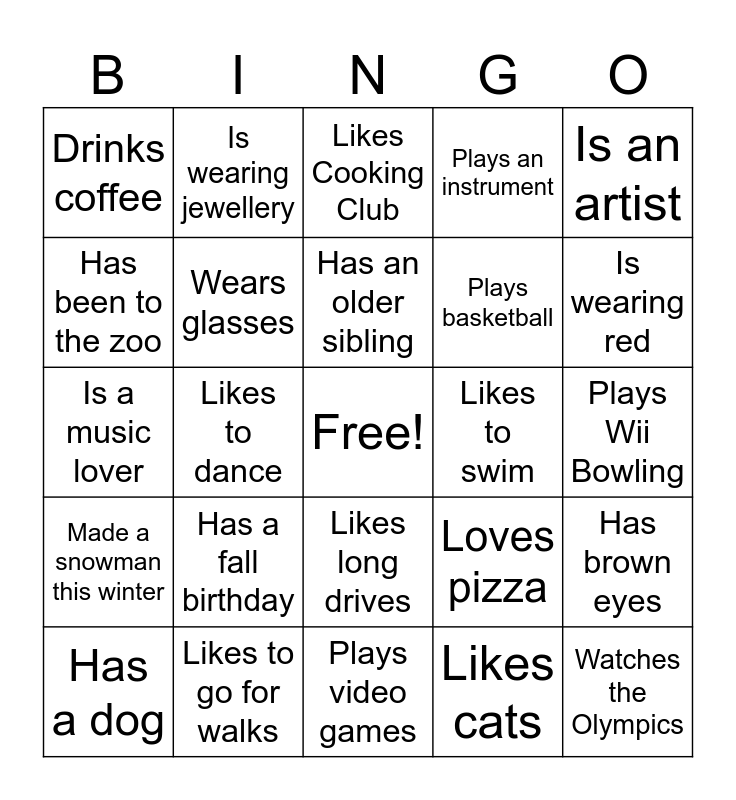 This bingo card has a free space and 24 words: Has a fall birthday, Likes to go for walks, Has an older sibling, Has a dog, Is an artist, Drinks coffee, Has been to the zoo, Is wearing jewellery, Likes to swim, Likes long drives, Plays basketball, Is a music lover, Loves pizza, Has brown eyes, Wears glasses, Likes cats, Plays Wii Bowling, Likes Cooking Club, Is wearing red, Likes to dance, Watches the Olympics, Made a snowman this winter, Plays an instrument and Plays video games.