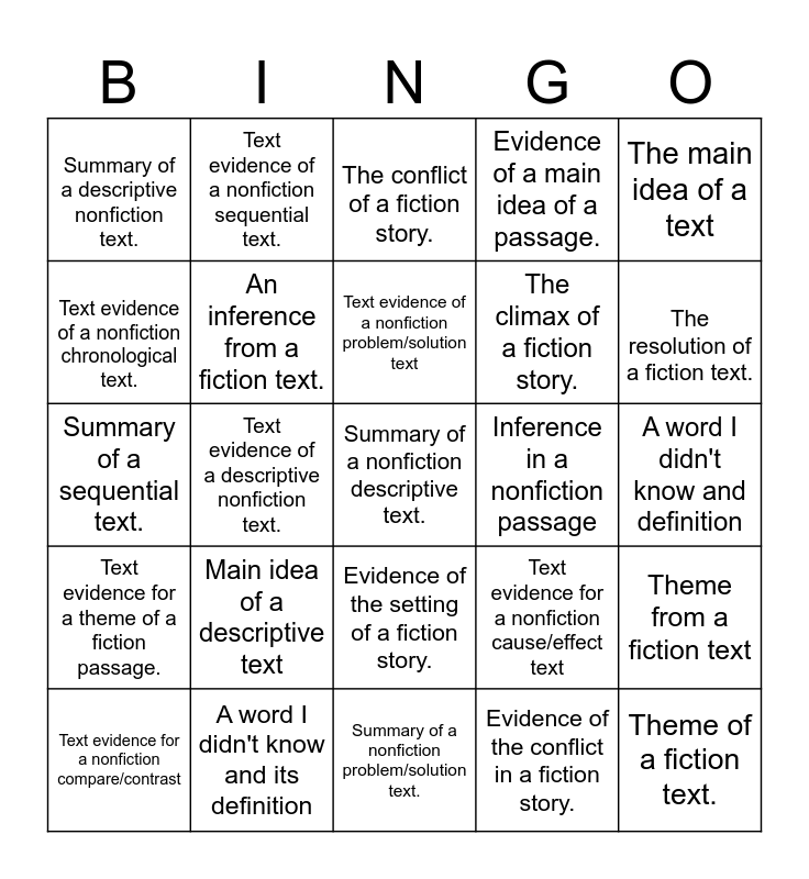 This bingo card has a free space and 24 words: Main idea of a descriptive text, A word I didn't know and its definition, Text evidence of a nonfiction problem/solution text, Text evidence for a nonfiction compare/contrast, The main idea of a text, Summary of a descriptive nonfiction text., Text evidence of a nonfiction chronological text., Text evidence of a nonfiction sequential text., Inference in a nonfiction passage, Evidence of the setting of a fiction story., The climax of a fiction story., Summary of a sequential text., Text evidence for a nonfiction cause/effect text, Theme from a fiction text, An inference from a fiction text., Evidence of the conflict in a fiction story., A word I didn't know and definition, The conflict of a fiction story., The resolution of a fiction text., Text evidence of a descriptive nonfiction text., Theme of a fiction text., Text evidence for a theme of a fiction passage., Evidence of a main idea of a passage. and Summary of a nonfiction problem/solution text..