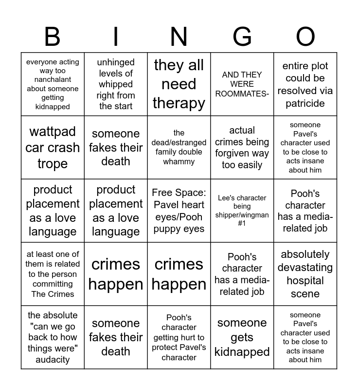 This bingo card has a free space and 48 words: Pooh's character has a surprise brother, someone Pavel's character used to be close to acts insane about him, the absolute "can we go back to how things were" audacity, Pooh's character getting hurt to protect Pavel's character, crimes happen, at least one of them is related to the person committing The Crimes, unhinged levels of whipped right from the start, major character death fakeout, wattpad car crash trope, MichaelTopten being the side couple of all time, someone fakes their death, AND THEY WERE ROOMMATES-, absolutely devastating hospital scene, Pooh's character has a media-related job, unhinged interior design choices, Pooh's character acting insane somehow works for Pavel's character, the dead/estranged family double whammy, Lee's character being shipper/wingman #1, they all need therapy, entire plot could be resolved via patricide, product placement as a love language, someone gets kidnapped, everyone acting way too nanchalant about someone getting kidnapped, actual crimes being forgiven way too easily, Pooh's character has a surprise brother, someone Pavel's character used to be close to acts insane about him, the absolute "can we go back to how things were" audacity, Pooh's character getting hurt to protect Pavel's character, crimes happen, at least one of them is related to the person committing The Crimes, unhinged levels of whipped right from the start, major character death fakeout, wattpad car crash trope, MichaelTopten being the side couple of all time, someone fakes their death, AND THEY WERE ROOMMATES-, absolutely devastating hospital scene, Pooh's character has a media-related job, unhinged interior design choices, Pooh's character acting insane somehow works for Pavel's character, the dead/estranged family double whammy, Lee's character being shipper/wingman #1, they all need therapy, entire plot could be resolved via patricide, product placement as a love language, someone gets kidnapped, everyone acting way too nanchalant about the kidnapping and actual crimes being forgiven way too easily.