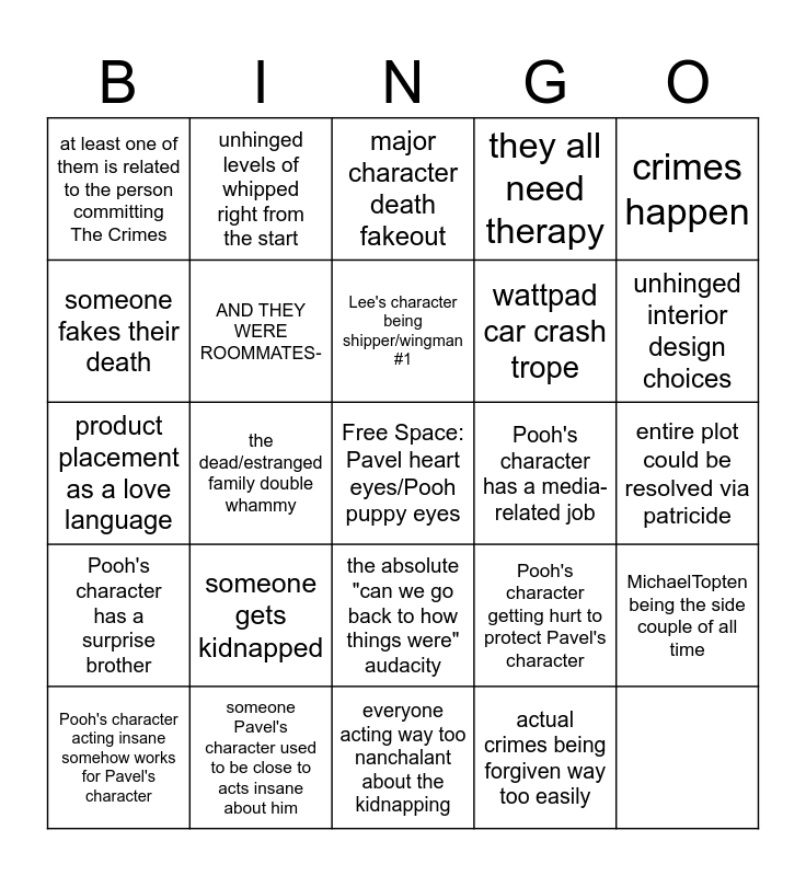 This bingo card has a free space and 24 words: Pooh's character has a surprise brother, someone Pavel's character used to be close to acts insane about him, the absolute "can we go back to how things were" audacity, Pooh's character getting hurt to protect Pavel's character, crimes happen, at least one of them is related to the person committing The Crimes, unhinged levels of whipped right from the start, major character death fakeout, wattpad car crash trope, MichaelTopten being the side couple of all time, someone fakes their death, AND THEY WERE ROOMMATES-, absolutely devastating hospital scene, Pooh's character has a media-related job, unhinged interior design choices, Pooh's character acting insane somehow works for Pavel's character, the dead/estranged family double whammy, Lee's character being shipper/wingman #1, they all need therapy, entire plot could be resolved via patricide, product placement as a love language, someone gets kidnapped, everyone acting way too nanchalant about the kidnapping and actual crimes being forgiven way too easily.
