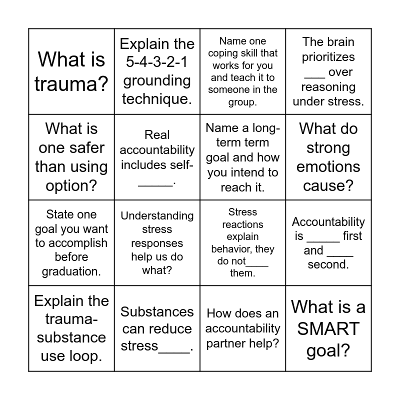 This bingo card has 20 words: Accountability is _____ first and ____ second., Trauma impacts the ____ system., Name one coping skill that works for you and teach it to someone in the group., ____ means being honest about where I am, not pretending to be where I'm not., Explain the trauma-substance use loop., What is one safer than using option?, Substances can reduce stress____., What is trauma?, State one goal you want to accomplish before graduation., Explain the 5-4-3-2-1 grounding technique., Understanding stress responses help us do what?, Stress reactions explain behavior, they do not____ them., Real accountability includes self-_____., What is a SMART goal?, Name a long-term term goal and how you intend to reach it., Explain box breathing., What do strong emotions cause?, The brain prioritizes ___ over reasoning under stress., How does an accountability partner help? and What is the PAUSE skill?.