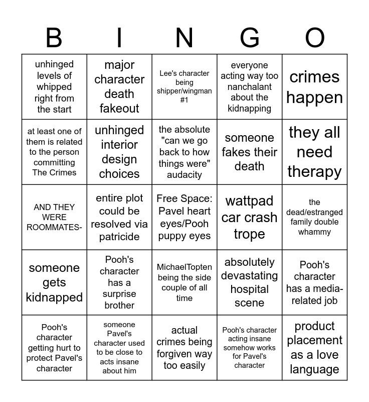 This bingo card has a free space and 24 words: Pooh's character has a surprise brother, someone Pavel's character used to be close to acts insane about him, the absolute "can we go back to how things were" audacity, Pooh's character getting hurt to protect Pavel's character, crimes happen, unhinged levels of whipped right from the start, at least one of them is related to the person committing The Crimes, major character death fakeout, wattpad car crash trope, MichaelTopten being the side couple of all time, someone fakes their death, AND THEY WERE ROOMMATES-, absolutely devastating hospital scene, Pooh's character has a media-related job, unhinged interior design choices, Pooh's character acting insane somehow works for Pavel's character, the dead/estranged family double whammy, Lee's character being shipper/wingman #1, they all need therapy, entire plot could be resolved via patricide, product placement as a love language, someone gets kidnapped, everyone acting way too nanchalant about the kidnapping and actual crimes being forgiven way too easily.