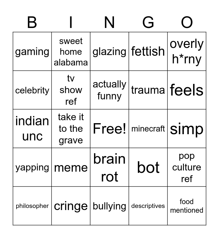 This bingo card has a free space and 24 words: meme, cringe, actually funny, philosopher, overly h*rny, gaming, celebrity, sweet home alabama, minecraft, brain rot, trauma, indian unc, bot, pop culture ref, tv show ref, descriptives, simp, glazing, feels, take it to the grave, food mentioned, yapping, fettish and bullying.