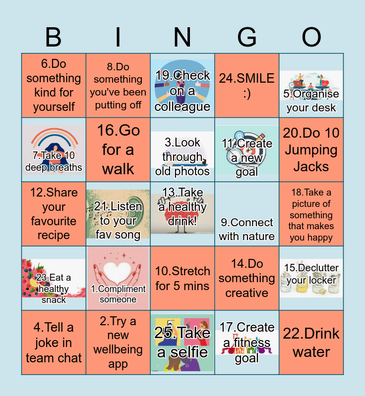 This bingo card has 11 images, a free space and 24 words: 1.Compliment someone, 2.Try a new wellbeing app, 3.Look through old photos, 4.Tell a joke in team chat, 5.Organise your desk, 6.Do something kind for yourself, 7.Take 10 deep breaths, 8.Do something you've been putting off, 9.Connect with nature, 10.Stretch for 5 mins, 11.Create a new goal, 12.Share your favourite recipe, 14.Do something creative, 15.Declutter your locker, 16.Go for a walk, 17.Create a fitness goal, 18.Take a picture of something that makes you happy, 19.Check on a colleague, 20.Do 10 Jumping Jacks, 21.Listen to your fav song, 22.Drink water, 23.Eat a healthy snack, 24.SMILE :) and 25.Take a selfie.