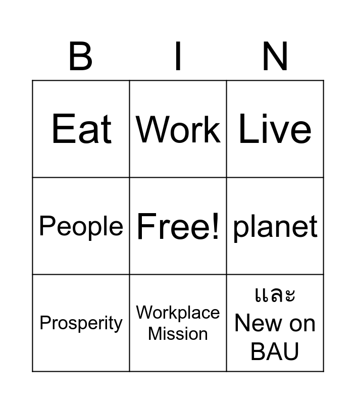 This bingo card has a free space and 8 words: People, Work, planet, Prosperity, Live, Eat, Workplace Mission and และ New on BAU.