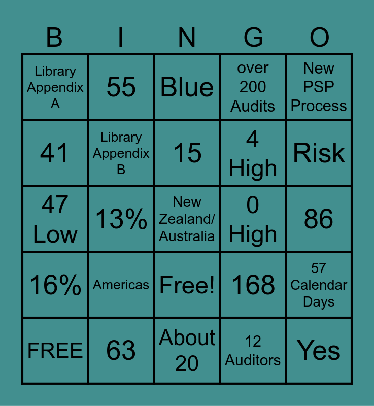 This bingo card has 26 words: Free!, 12 Auditors, 15, 63, New PSP Process, Library Appendix A, 41, 55, 86, 168, 4 High, 47 Low, 57 Calendar Days, FREE, 13%, Sabrina, over 200 Audits, 16%, Blue, New Zealand/ Australia, Risk, About 20, 0 High, Americas, Library Appendix B and Yes.