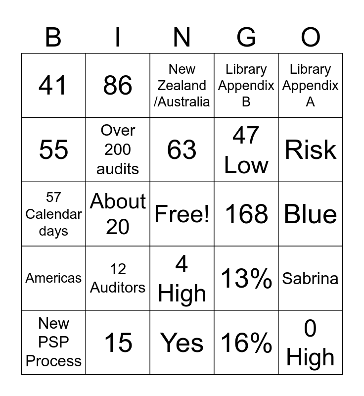 This bingo card has a free space and 24 words: 12 Auditors, 15, 63, New PSP Process, Library Appendix A, 41, 55, 86, 168, 4 High, 47 Low, 57 Calendar days, 13%, Sabrina, Over 200 audits, 16%, Blue, New Zealand /Australia, Risk, About 20, 0 High, Americas, Library Appendix B and Yes.