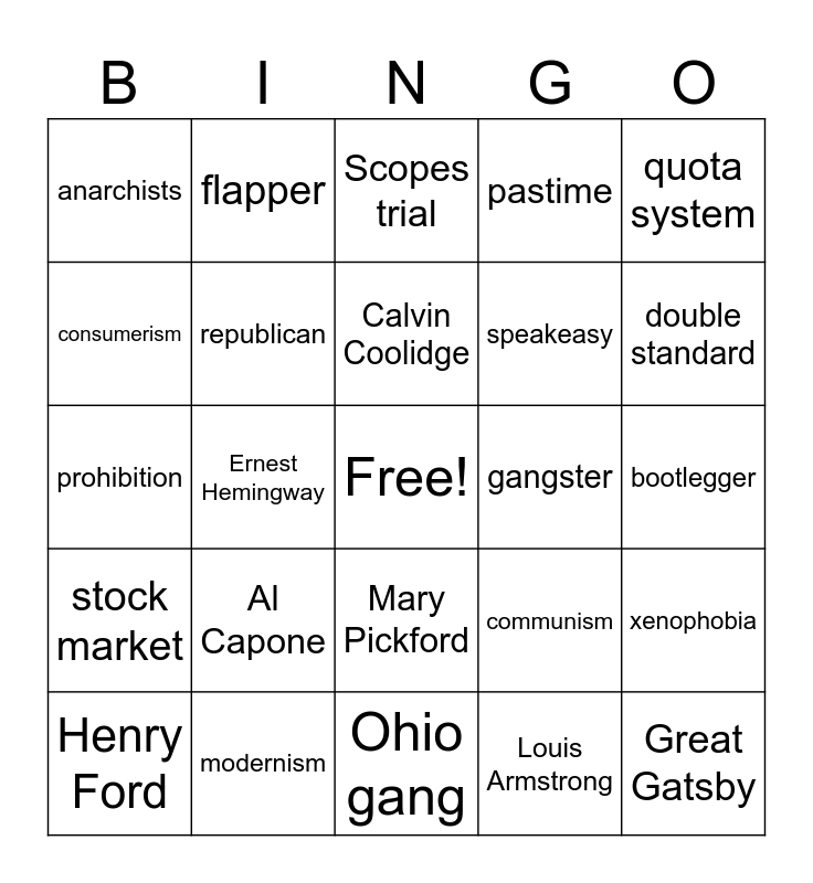 This bingo card has a free space and 25 words: Al Capone, Ohio gang, Calvin Coolidge, Henry Ford, quota system, anarchists, consumerism, flapper, gangster, Mary Pickford, speakeasy, prohibition, communism, xenophobia, republican, urban sprawl, bootlegger, Scopes trial, double standard, Ernest Hemingway, Great Gatsby, modernism, stock market, pastime and Louis Armstrong.