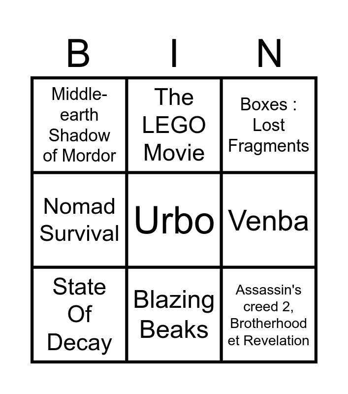 This bingo card has a free space and 8 words: Venba, Boxes : Lost Fragments, The LEGO Movie, State Of Decay, Middle-earth Shadow of Mordor, Assassin's creed 2, Brotherhood et Revelation, Nomad Survival and Blazing Beaks.