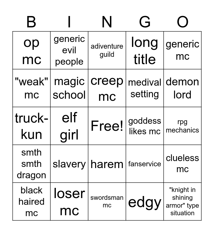 This bingo card has a free space and 24 words: slavery, loser mc, creep mc, black haired mc, generic mc, op mc, "weak" mc, generic evil people, goddess likes mc, harem, medival setting, truck-kun, fanservice, clueless mc, magic school, edgy, rpg mechanics, adiventure guild, demon lord, elf girl, "knight in shining armor" type situation, smth smth dragon, long title and swordsman mc.