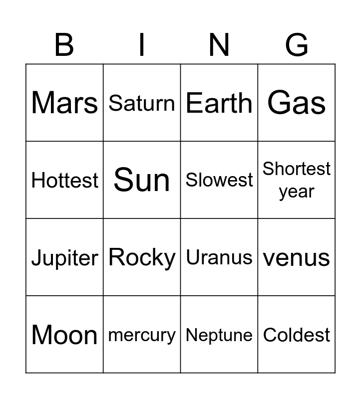 This bingo card has 16 words: mercury, venus, Earth, Mars, Jupiter, Saturn, Uranus, Neptune, Hottest, Sun, Moon, Gas, Rocky, Shortest year, Slowest and Coldest.