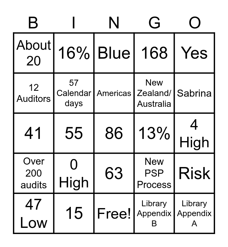 This bingo card has a free space and 24 words: 47 Low, 0 High, Americas, Library Appendix B, Yes, About 20, 16%, Blue, 13%, 4 High, 41, 57 Calendar days, New PSP Process, Risk, 12 Auditors, 15, Free!, 168, Sabrina, Over 200 audits, 55, 63, New Zealand/ Australia and Library Appendix A.