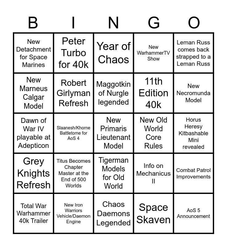 This bingo card has a free space and 24 words: Titus Becomes Chapter Master at the End of 500 Worlds, New Iron Warriors Vehicle/Daemon Engine, Maggotkin of Nurgle legended, Total War Warhammer 40k Trailer, Leman Russ comes back strapped to a Leman Russ, New Detachment for Space Marines, New Marneus Calgar Model, Peter Turbo for 40k, New Old World Core Rules, Tigerman Models for Old World, 11th Edition 40k, Dawn of War IV playable at Adepticon, Info on Mechanicus II, Combat Patrol Improvements, Robert Girlyman Refresh, Space Skaven, Horus Heresy Kitbashable Mini revealed, Year of Chaos, New Necromunda Model, Slaanesh/Khorne Battletome for AoS 4, AoS 5 Announcement, Grey Knights Refresh, New WarhammerTV Show and Chaos Daemons Legended.