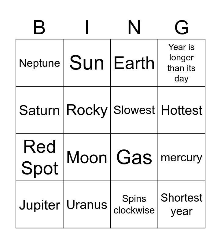 This bingo card has 20 words: mercury, venus, Earth, Mars, Jupiter, Saturn, Uranus, Neptune, Red Spot, Sun, Moon, Gas, Rocky, Shortest year, Slowest, Coldest, Hottest, Year is longer than its day, Spins clockwise and spins sideways.